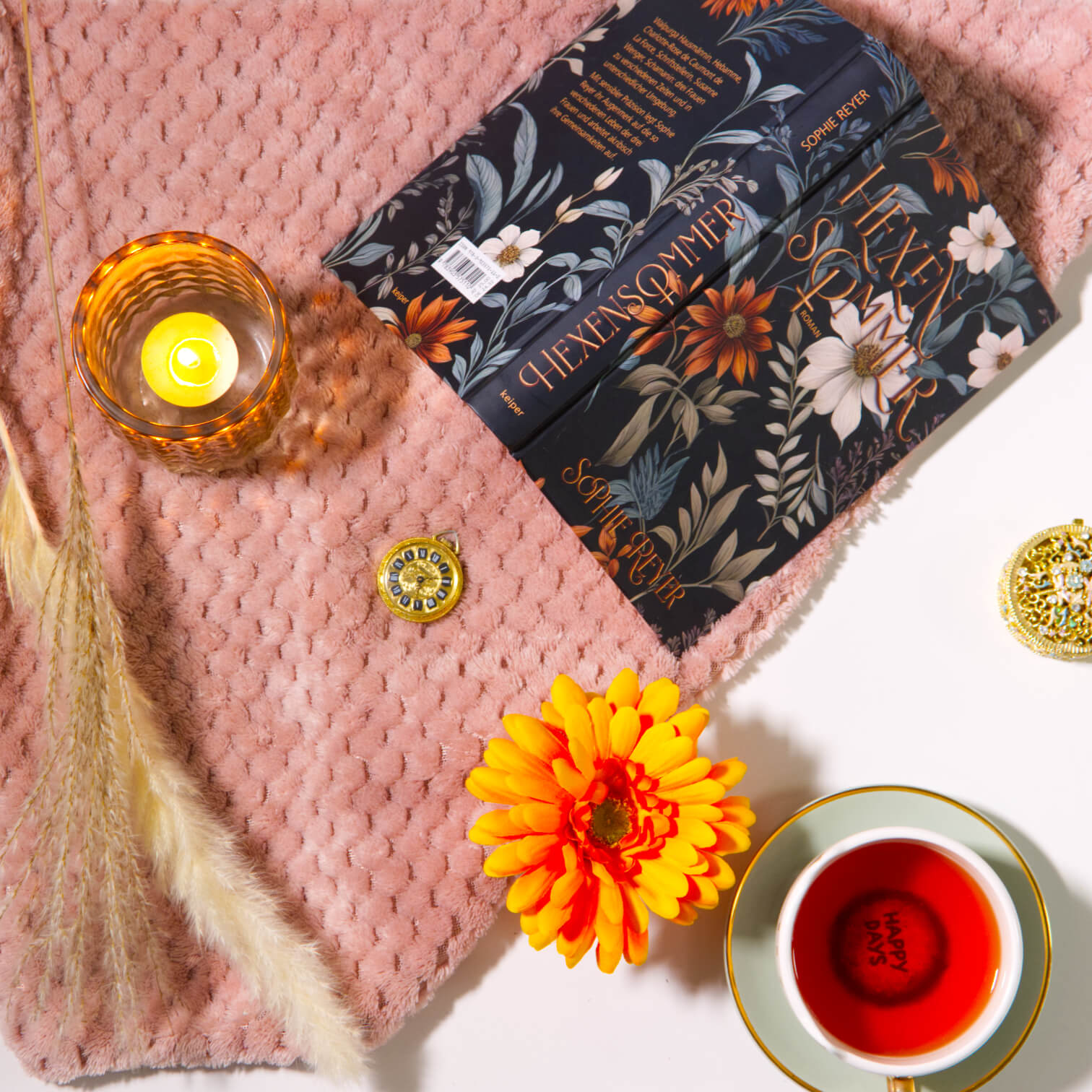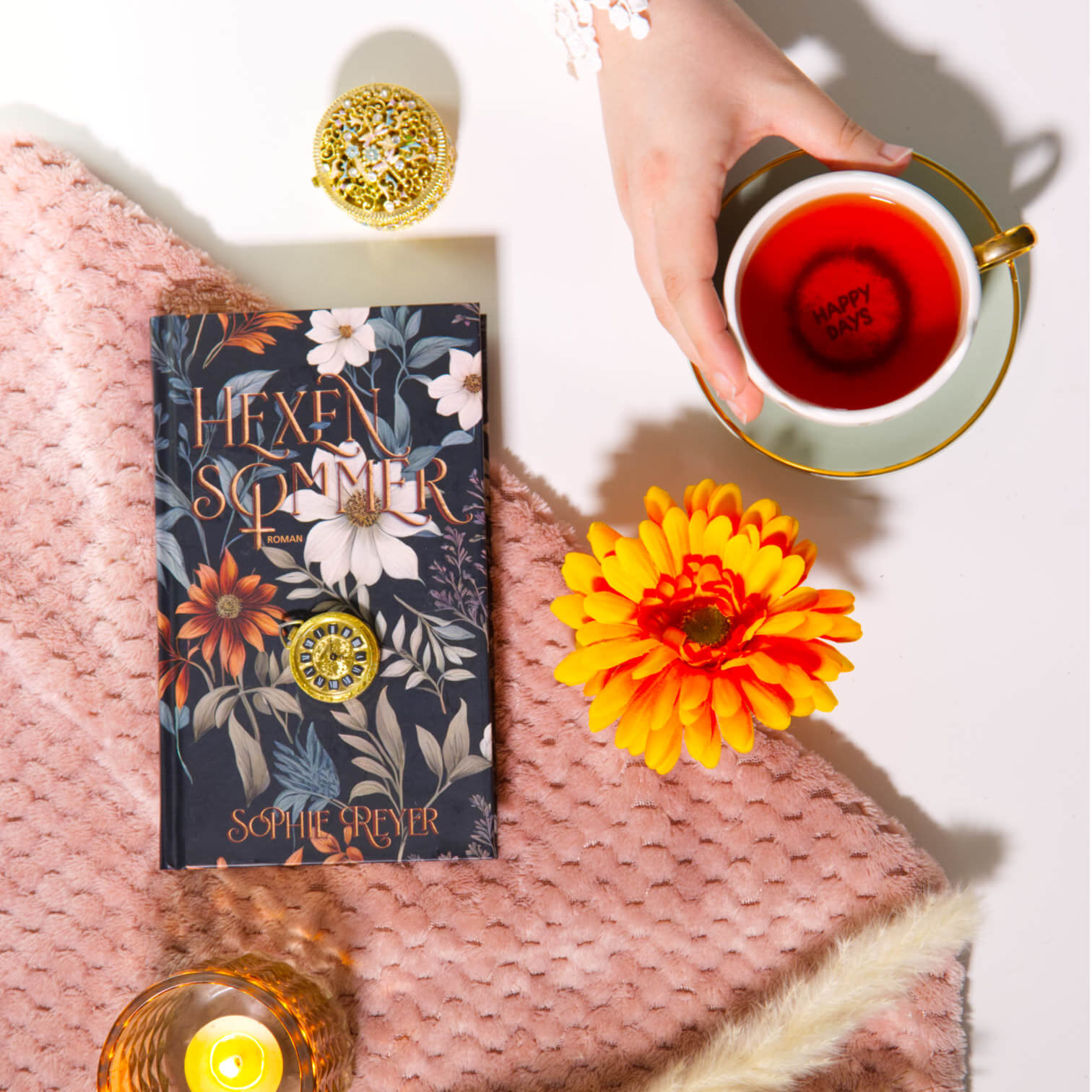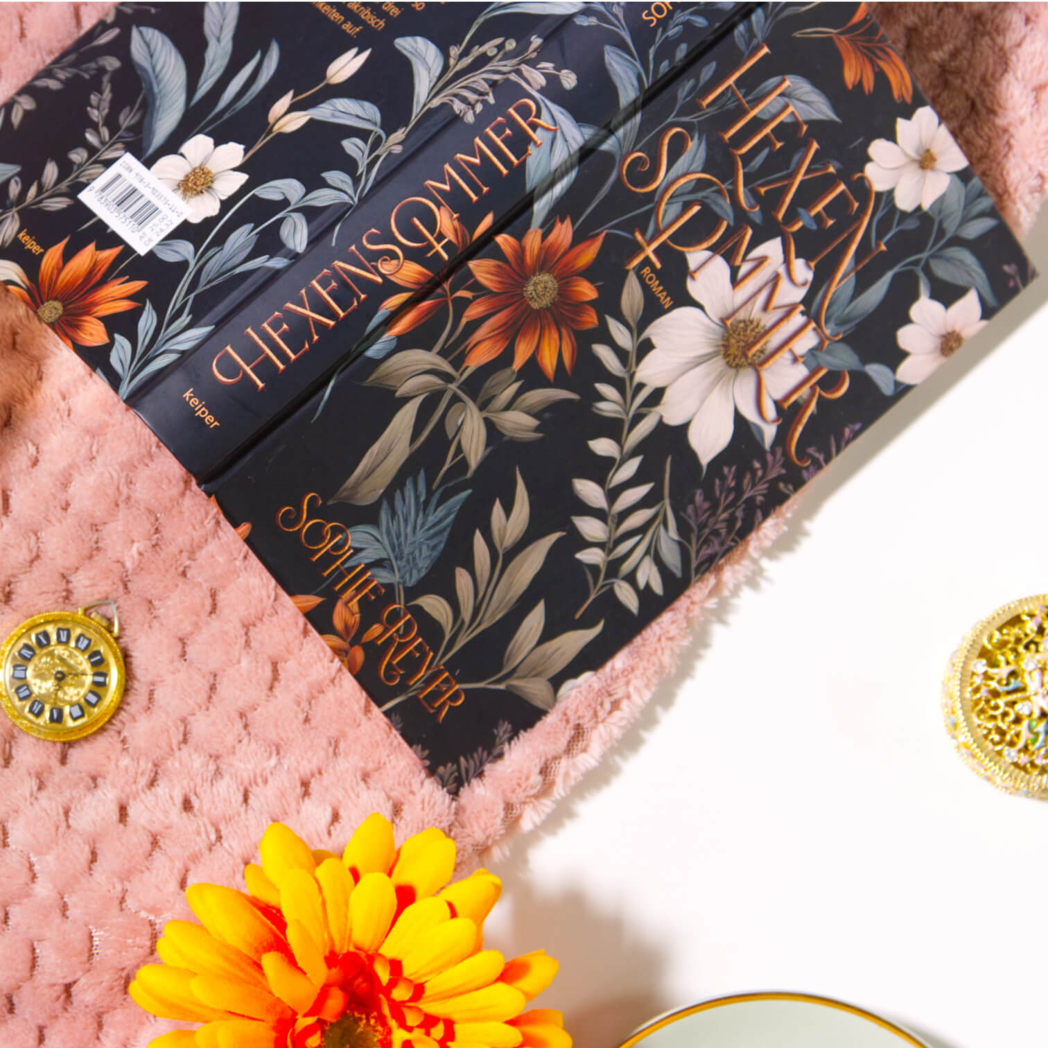 Für das Cover hatte ich von Beginn an mehrere gestalterische Ideen: Eine Darstellung der drei Frauen im Splitscreen, eine visuelle Verbindung über Zeit und Raum hinweg – oder ein Symbol für das überlieferte Wissen, das sie verbindet. Letztlich entschied ich mich für ein florales Motiv, das mit seiner dunklen Farbgebung die Tiefe und Schwere der Themen spürbar macht. Die Typografie wurde so bearbeitet, dass durch Struktur und Schatten ein subtiler 3D-Effekt entsteht. Das „O“ – als Zeichen der Weiblichkeit – setzt den feministischen Kern des Romans gezielt in Szene.
